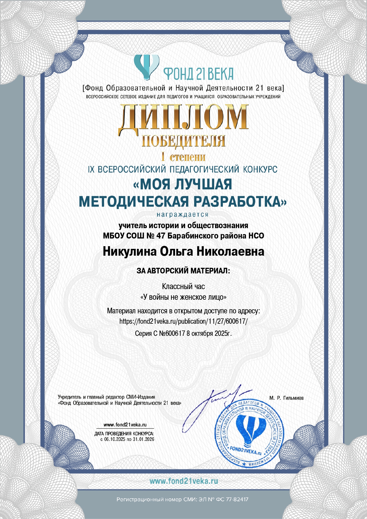 Диплом победителя 1 степени Всероссийский конкурс "Лучший сайт педагога - 2021"