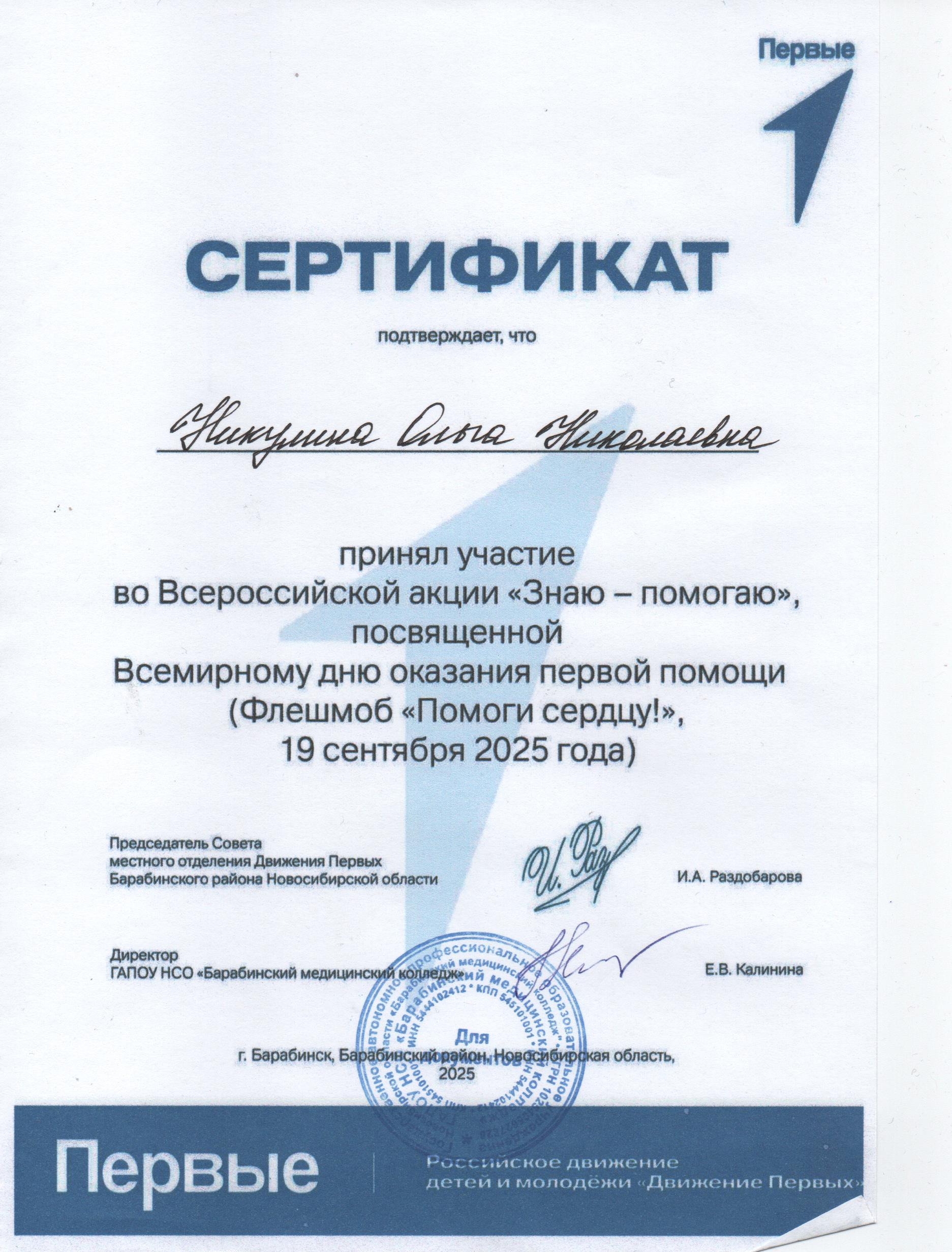 Сертификат участника Всероссийской акции "Знаю-помогаю", посвященной Всероссийскому дню оказания первой помощи (Флешмоб "Помоги сердцу!", 19 сентября 2025 года)