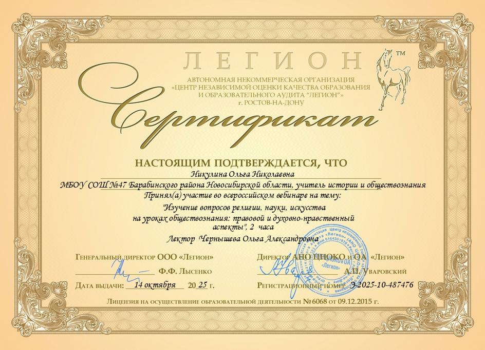 Сертификат участника всероссийского вебинара на тему: "Изучение вопросов религии, науки, искусства на уроках обществознания: правовой и духовно-нравственный аспекты", 2ч., Из-во "Легион", 14.10.2025 г.