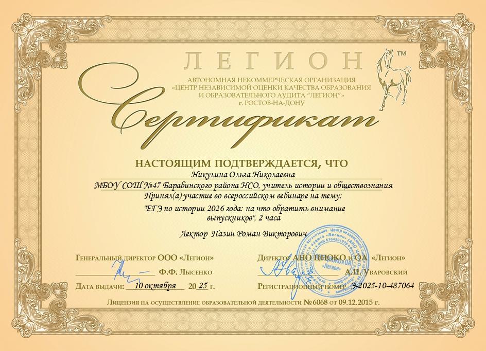 Сертификат участника всероссийского вебинара на тему: ""ЕГЭ по истории 2026 года: на что обратить внимание выпускников", 2ч., Из-во "Легион", 10.10.2025г.