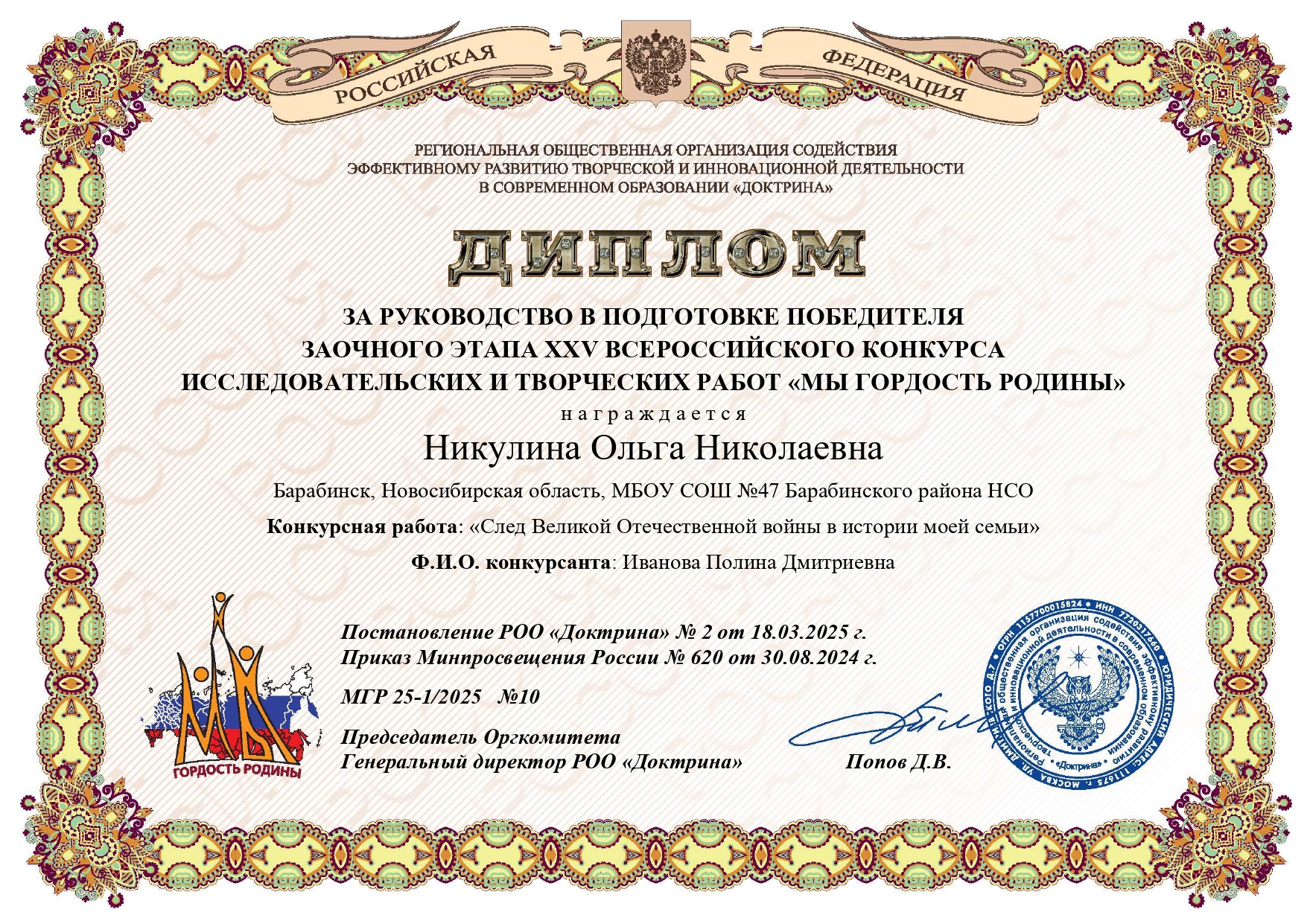 Диплом за руководство в подготовке Победителя заочного этапа XXV Всероссийского конкурса исследовательских и творческих работ "Мы гордость Родины", 2025г.