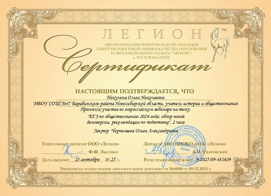 Сертификат участника всероссийского вебинара на тему: "ЕГЭ по обществознанию 2026 года: обзор новой демоверсии, рекомендации по подготовке", 2ч., Из-во "Легион", 23.09.2025г.